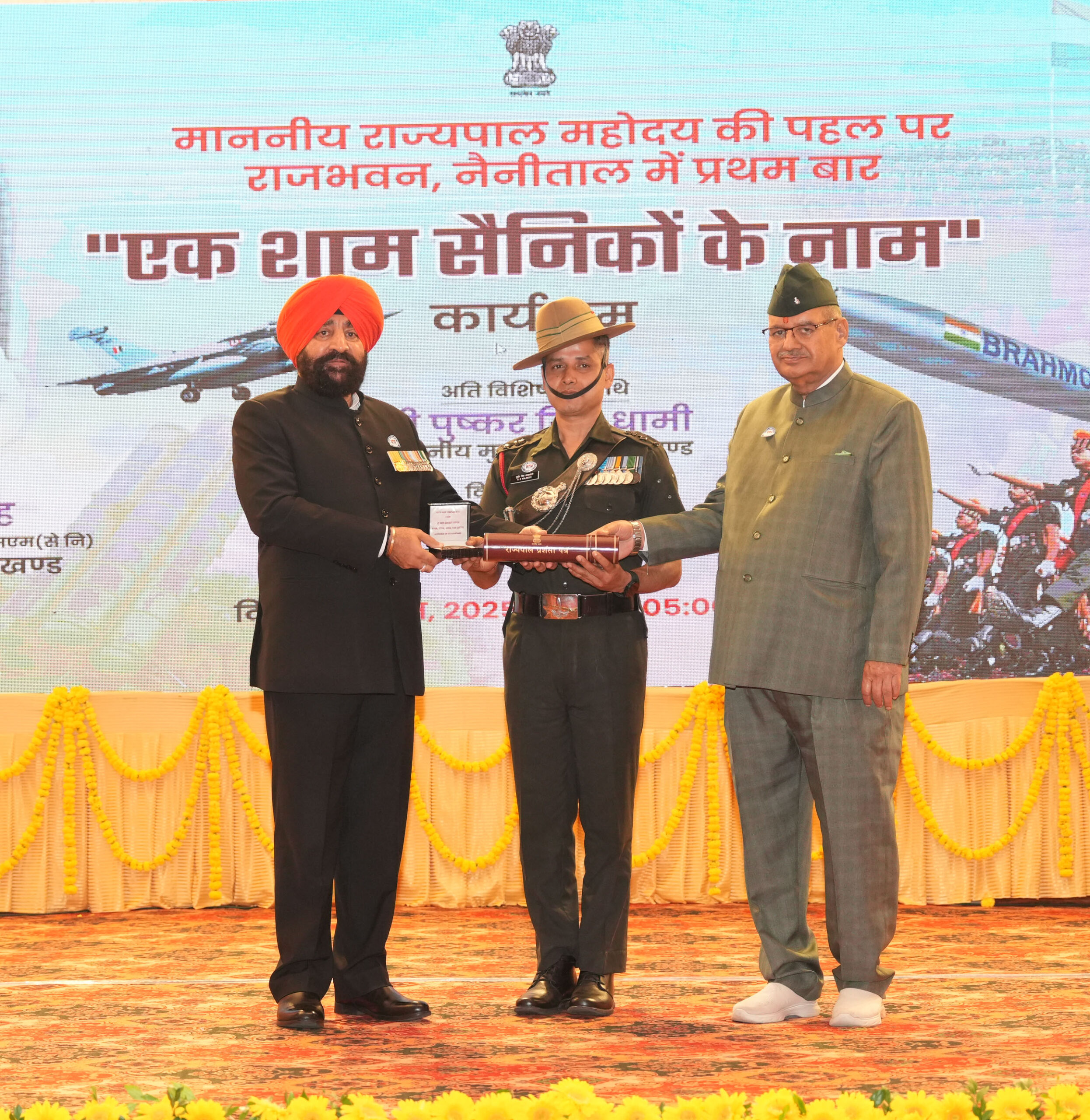 इस अवसर मुख्यमंत्री पुष्कर सिंह धामी ने अपने वीडियो संदेश में कहा कि उत्तराखण्ड केवल पहाड़ों की धरती नहीं, यह देश की रक्षा करने वाले वीरों की भूमि है, जहाँ हमारे जवानों ने हमेशा अद्वितीय साहस का परिचय दिया है। आज जब इतने अलंकृत वीर सैनिक एक साथ एक मंच पर उपस्थित है, तो यह केवल सम्मान का अवसर नहीं, बल्कि प्रेरणा का सशक्त प्रतीक बन जाता है। उन्होंने कहा कि राज्यपाल की प्रेरणा से राजभवन नैनीताल में पहली बार सैनिकों के सम्मान में यह अभूतपूर्व कार्यक्रम आयोजित हो रहा है, जो हमारी प्रदेश सरकार की सर्वाेच्च प्राथमिकता है।