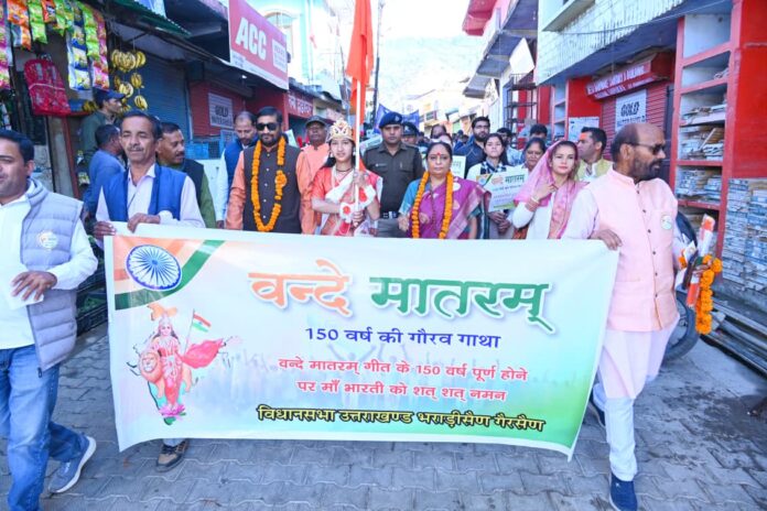 वंदेमातरम की रचना 1875 में महान साहित्यकार बंकिमचंद्र चट्टोपाध्याय ने की थी। यह गीत उनकी श्रेष्ठ कृति ‘आनंदमठ’ में शामिल है। वंदेमातरम ने स्वतंत्रता संग्राम के दौरान राष्ट्रभक्ति की ज्योति प्रज्वलित की और अंग्रेजों के विरुद्ध लड़ाई में यह गीत क्रांतिकारियों और जनता का सर्वोच्च प्रेरणा-स्रोत बना। 1937 में इसे कांग्रेस कार्यसमिति ने राष्ट्रीय गीत का दर्जा दिया और 1950 में भारतीय संविधान सभा ने इसे आधिकारिक राष्ट्रीय गीत के रूप में स्वीकार किया। आज गैरसैंण में आयोजित इस प्रभात फेरी के माध्यम से वंदेमातरम के 150 वर्षों की इस अमर गाथा को पुनः स्मरण कर जनमानस में राष्ट्रीय गर्व और एकता का संदेश दिया गया। इस अवसर पर स्थानीय विधायक अनिल नौटियाल, राज्य मंत्री रामचंद्र गौड़, चमोली जिला अध्यक्ष गजपाल बर्थवाल, ब्लॉक प्रमुख दुर्गा देवी, जिला महामंत्री अरुण मैठानी तथा विक्रम बर्थवाल सहित अनेक जनप्रतिनिधि एवं गणमान्य लोग उपस्थित रहे।