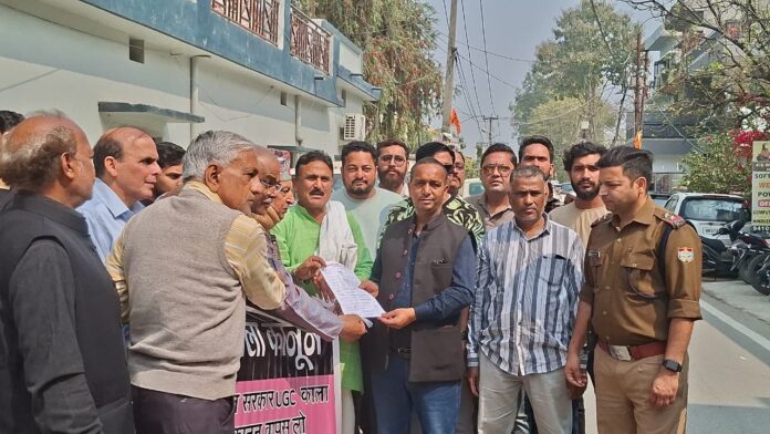 देहरादून। एक पक्षीय यूजीसी के प्रस्तावित काले कानून/ड्राफ्ट रेगुलेशन के सामाजिक असंतुलन संबंधी गृहमंत्री भारत सरकार अमित शाह को संबोधित एक ज्ञापन उत्तराखंड ब्राह्मण समाज महासंघ द्वारा नायब तहसीलदार सदर सुरेश सेमवाल को सौंपा। जिला शासन के प्रतिनिधि नायब तहसीलदार सदर श्री सेमवाल ने ब्राह्मण प्रतिनिधिमंडल को आश्वस्त किया कि वे उनका ज्ञापन गृहमंत्री अमित शाह को प्रेषित कर देंगे।